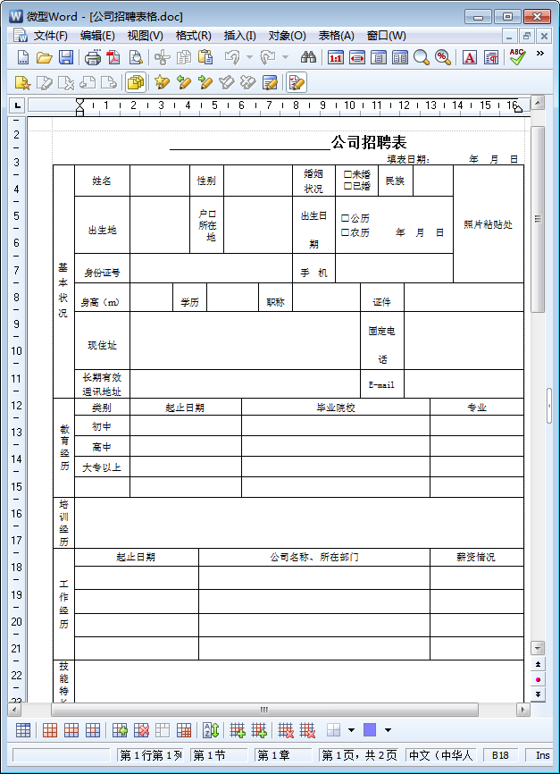 前面小编为大家整理带来了一份免费版excel应聘人员登记表模板,本节内容小编为大家整理带来的则是一份doc格式免费版公司招聘表格模板,虽然应聘人员登记表和公司招聘表格所涵盖的内容都差不多,但在一些细节上还是有所区别和不同的,感兴趣的朋友可以将这两者下载下来对比一下再进行选取使用哦!