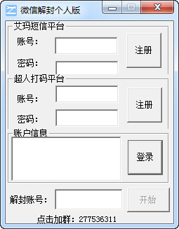 现在如果没个微信还怎么与人交流,微信目前用户有5个多亿人,有时候可能由天各种原因微信号被封了,那要怎么办呢?微信解封个人版来帮助你!微信解封个人版是一款按照腾讯正常步骤来自动解封的工具,软件小巧,界面简单,有需要的欢迎下载使用。