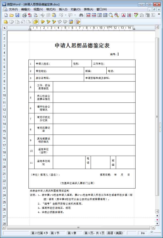 教师资格证申请人思想品德鉴定表是申请教师资格证必备的表格之一,表格中包含有申请人姓名、性别、工作单位及工作、政治思想表现等,本节内容小编为大家带来的是一份空白申请人思想品德鉴定表,需要下载打印使用的朋友们点击本文下方相应的下载地址进行下载即可!