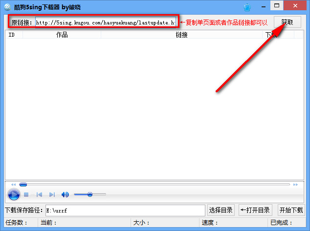酷狗5sing原创音乐基地是目前最大最火的音乐原创平台,下载里面的好听原创音乐的有需要积分,怎样可以免费下载呢?酷狗5sing下载链接解析器是一款专门可以批量下载酷狗5sing原创音乐的下载器,软件使用简单,纯绿色,有需要的快拿走吧!