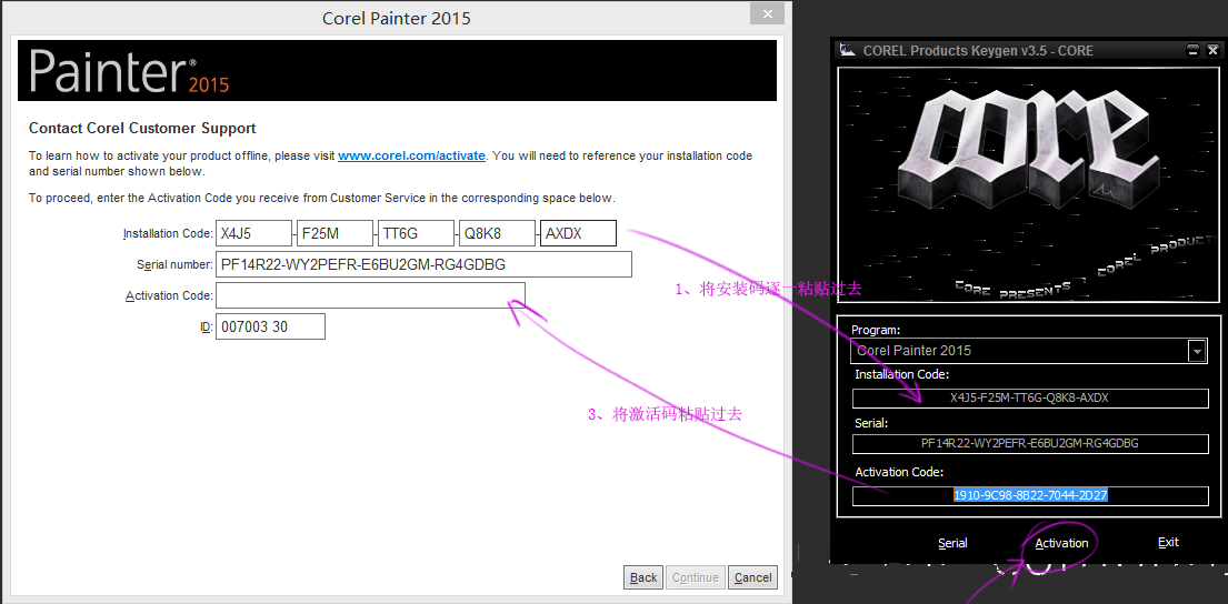 13、先将安装码一行行粘贴到注册机中,注意:中间需要打“-”号,然后再注册机上点击[Activation]按钮