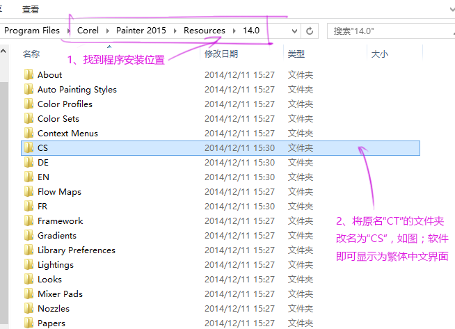 16、找到Corel Painter 2015安装文字,将“CT”文件夹改名为“CS”,软件即可显示繁体中文界面