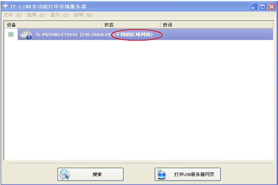 双击桌面上TL-PS310U快捷方式打开软件界面,电脑用网线连接好TL-PS310U,打印服务器默认IP为192.168.0.10,如果与您电脑不在同一网段,软件会提示不同区域的网络。