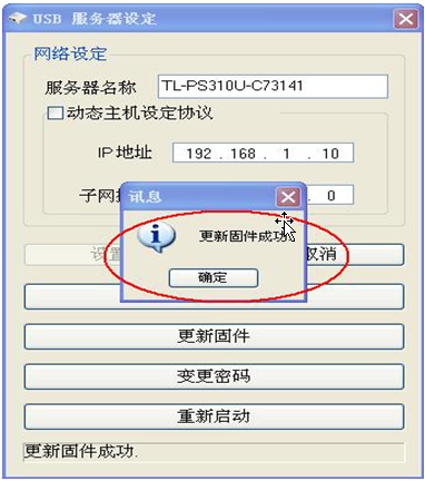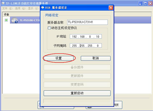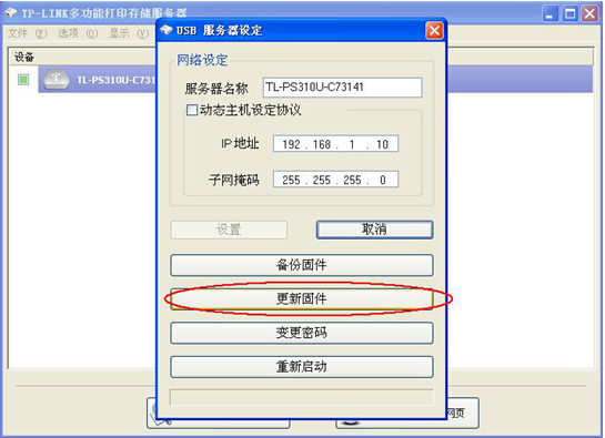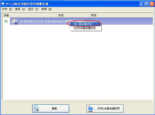 TL-PS310U的IP地址与电脑在同一网段后,右键点击打印服务器选择USB服务器设定,升级打印服务器的固件。