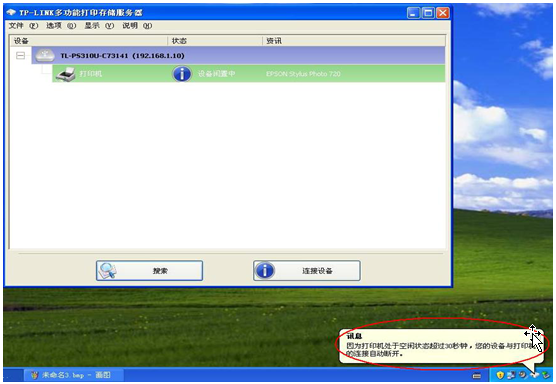 将USB线连接打印服务器与打印机,在配置软件中点击“连接设备”按钮连接打印机,安装好打印机的驱动。