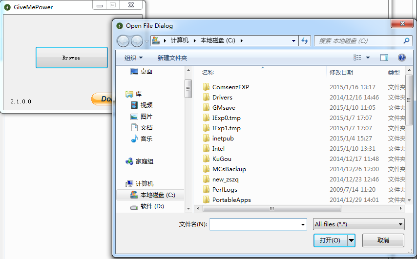 GiveMePower 的使用方法十分简单,运行后界面上就只有一个「Browse」的按钮,点击后会弹出选择框让你选择需要使用系统级别权限去执行的应用程序