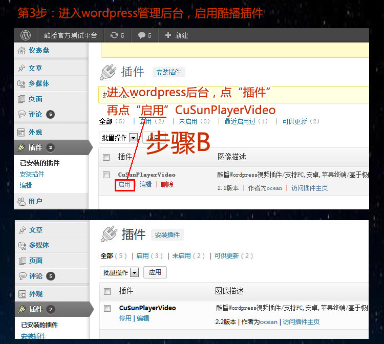 3、进入wordpress管理后台,启用酷播插件