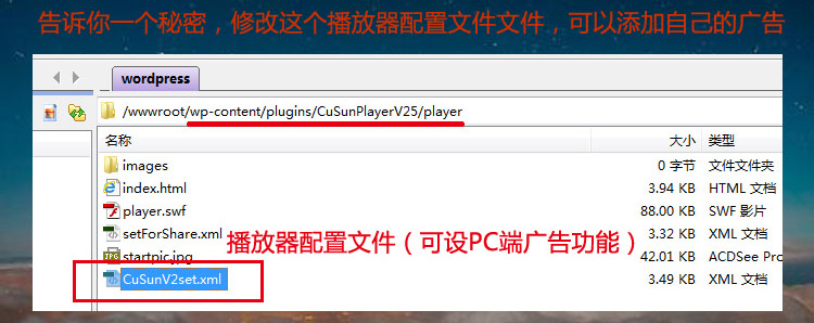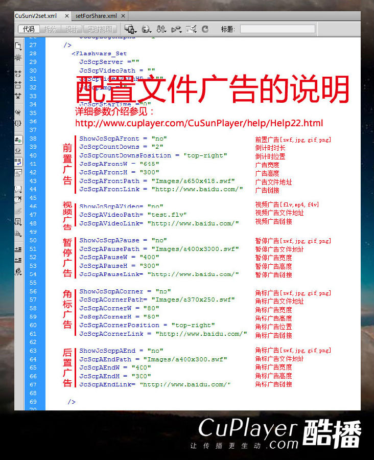 5、修改这个播放器配置文件,可以添加自己的广告