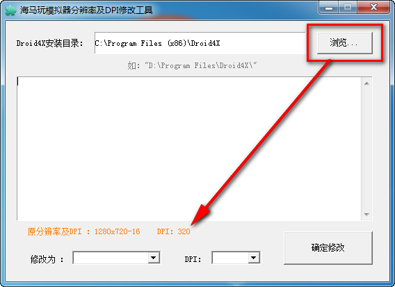 2、打开软件后单击"浏览"选择海马玩模拟器的安装目录。选择后会显示原分辨率及DPI值。