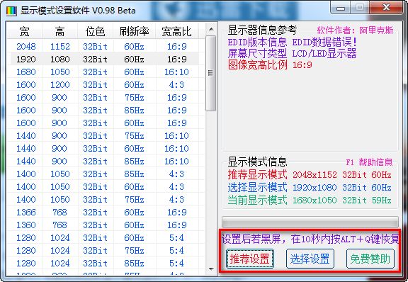 2、增加读取EDID的数据有错误时在EDID版本信息处提示(主要是注册表损坏造成)