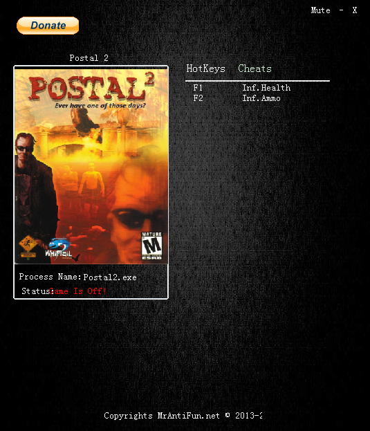 《喋血街头2》两项修改器,支持最新V1417版本游戏,MrAntiFun制作,具有无限生命和无限子弹功能,使用时先运行游戏,再启动修改器。