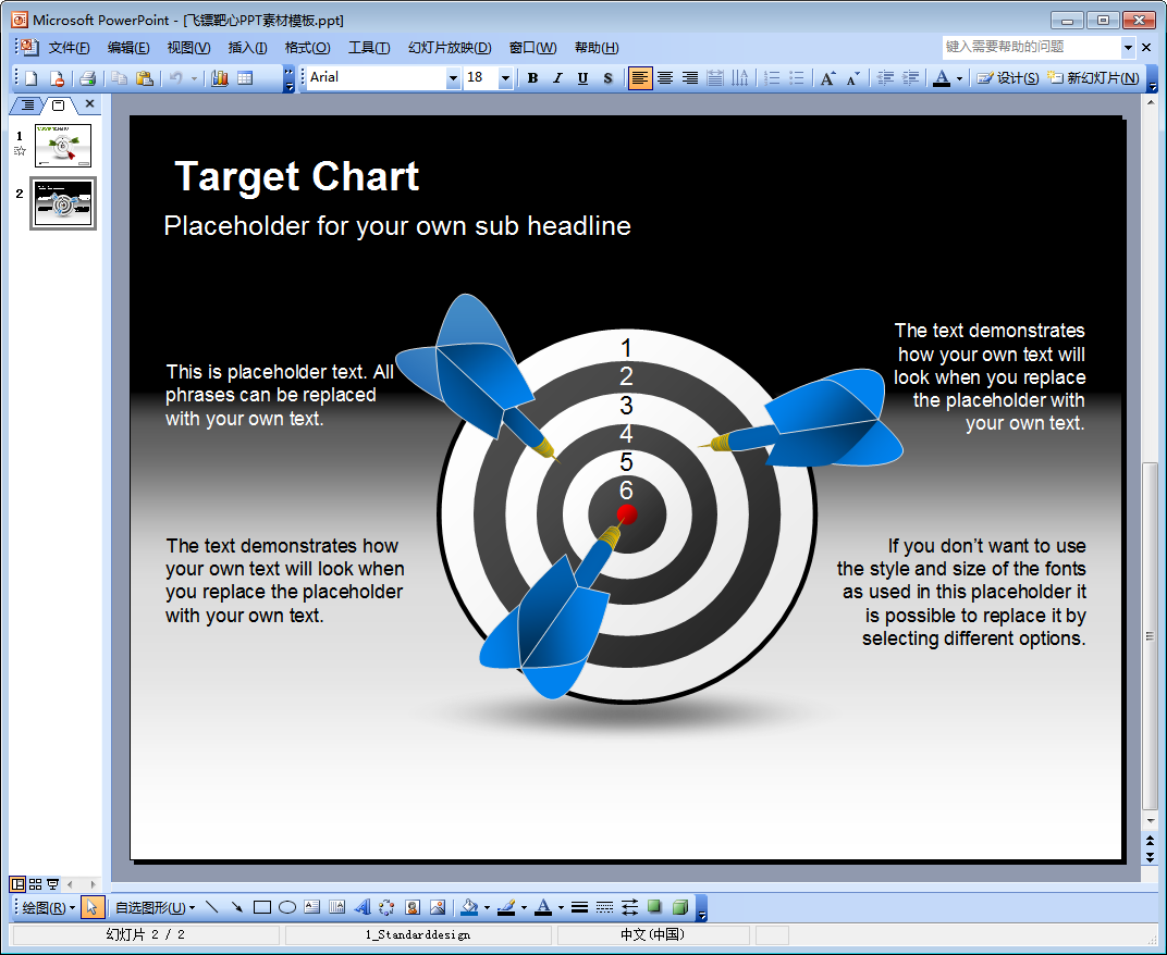 在一些优秀的ppt作品中我们经常会发现诸如飞镖靶心这样的素材,的确,这样的ppt往往能让人精神一振,目标明确,不过像飞镖靶心这样的PPT素材是如何制作的呢?——如何制作的,这是后话,本节内容小编为大家整理带来的是一份飞镖靶心PPT素材模板,如果你需要这样的素材的话,点击本文相应的下载地址进行下载即可使用该模板哦!——没错!就是这么方便,关键还免费哦!