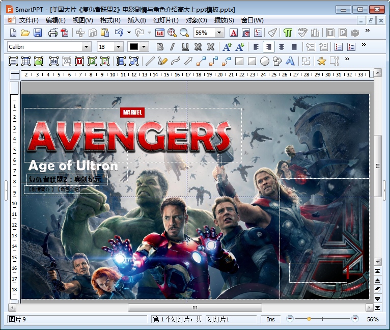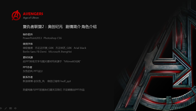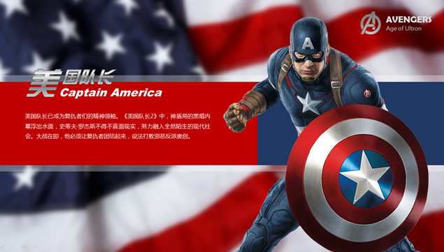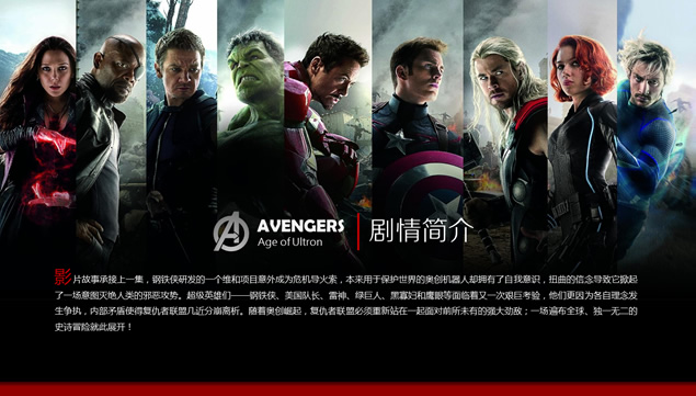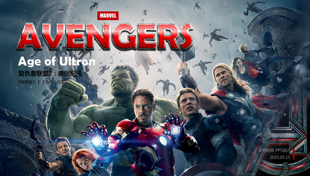 复仇者联盟2日前正在全国各大影院上映,有朋友给小编留言,说希望小编能整理出一份看起来高大上的关于介绍复仇者联盟2的ppt,于是小编紧赶慢赶地终于为大家整理带来了这份关于介绍复仇者联盟2的PPT,该ppt详细介绍了美国大片《复仇者联盟2》电影剧情与角色,是一份真正意义上的复仇者联盟2ppt,当然,这也是一份非常适合作为电影主题ppt模板或是复仇者联盟2PPT素材使用的文档,有需要的朋友点击本文相应的下载地址即可下载使用该复仇者联盟2PPT相关内容哦!