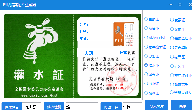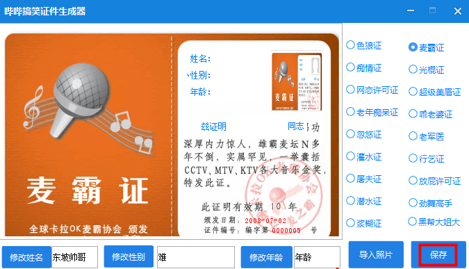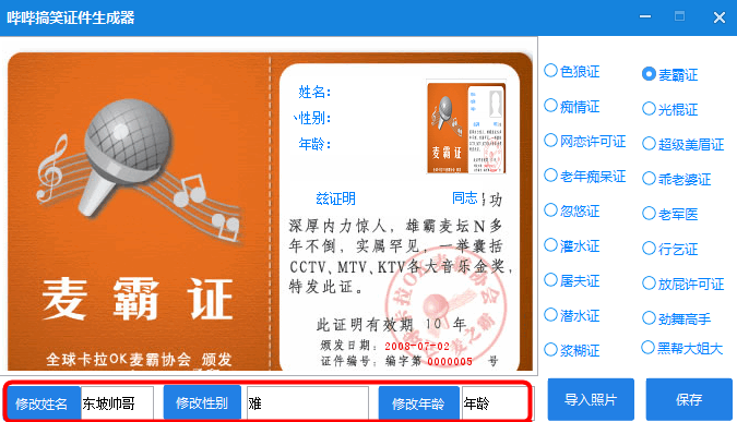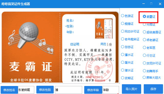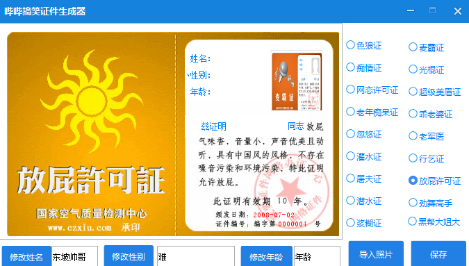 哔哔搞笑证件生成器其实就是款十分好用的证件制作软件。最大特点就是制作出各种搞笑证件,还能被大家能够用于各种场所!