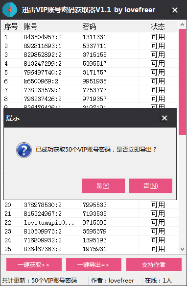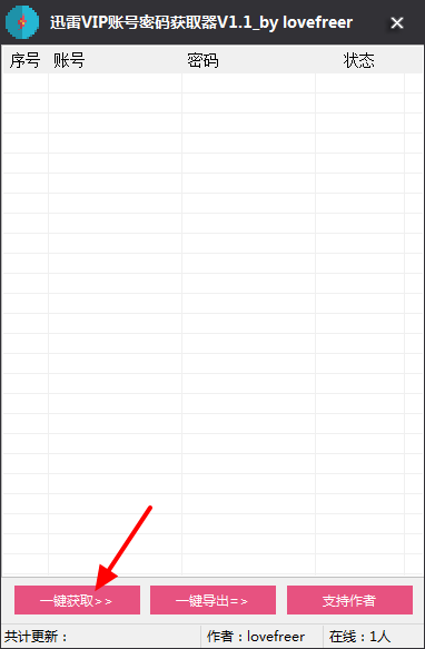 1、打开迅雷VIP账号密码获取器,点击左下角【一键获取】按钮