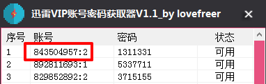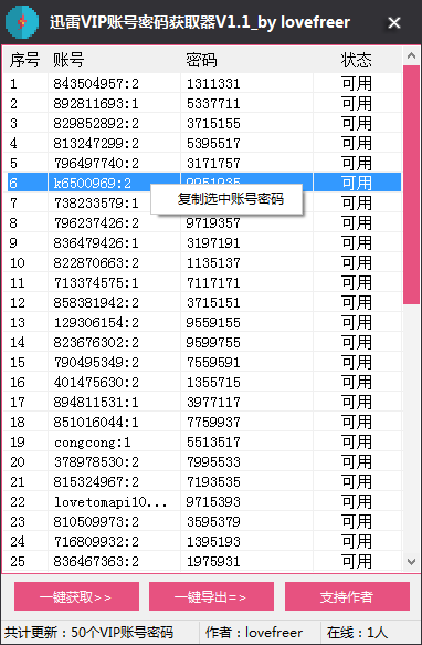 3、右键点击任意迅雷VIP账号即可复制其账号和密码