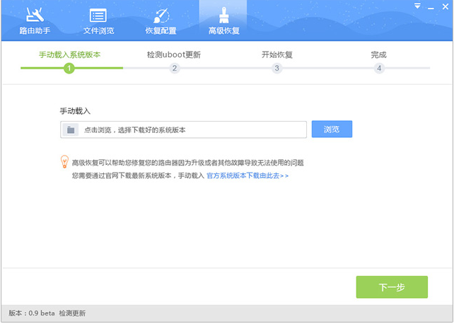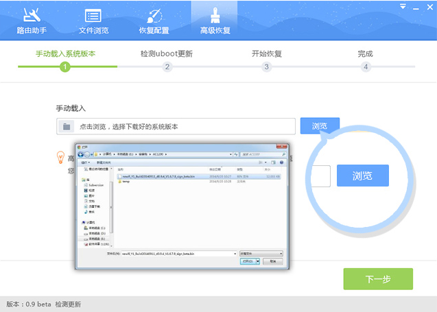 1、下载打开小云路由助手,进入高级回复界面后,点击浏览,点击右下角选择文件类型,默认为:bin file(*.bin)可选择相应固件刷机,如果需要升级UBOOT文件,需要选择全部文件模式:All file(*.*),选择完成后点击下一步