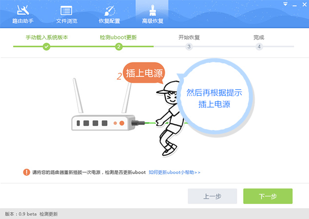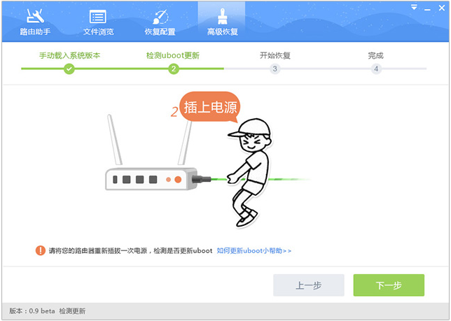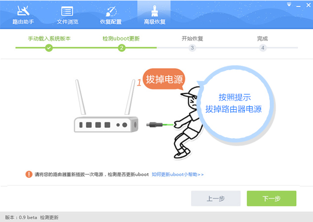 3、待小云路由器助手检测到路由器进入uBoot模式后,点击【下一步】
