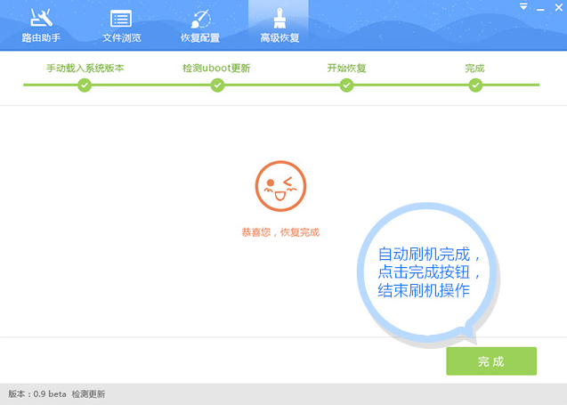 当你看到这个界面时,那么恭喜你!刷机完成,点击完成按钮,结束刷机操作!!