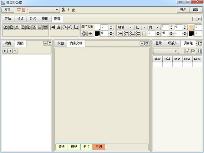 微型办公室官方版是一款全能的跨平台多类型文档编辑、交流软件,当前包含文字(富文本)编辑器、数学公式编辑器、矢量图形编辑器、图像(图片)编辑器,同时包含XMPP即时通信客户端。微型办公室对于文字排版可在一定程度代替传统桌面软件,对于图形、图像编辑具有一定优势,可以编辑教育教学文档、新闻报道文档、商品信息文档……,特别适合于编辑微文章、长微博,可以导出图片发布,也可以直接发送、接收可编辑文档,使即时通信不再局限于简单文本和只读图片,大大丰富了即时通信的形式和内容。