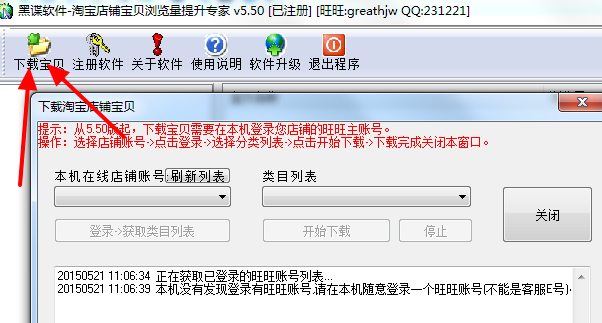 3、点击【下载宝贝】,自动获取当前在线的旺旺账号,下载您要提升浏览量的淘宝宝贝!