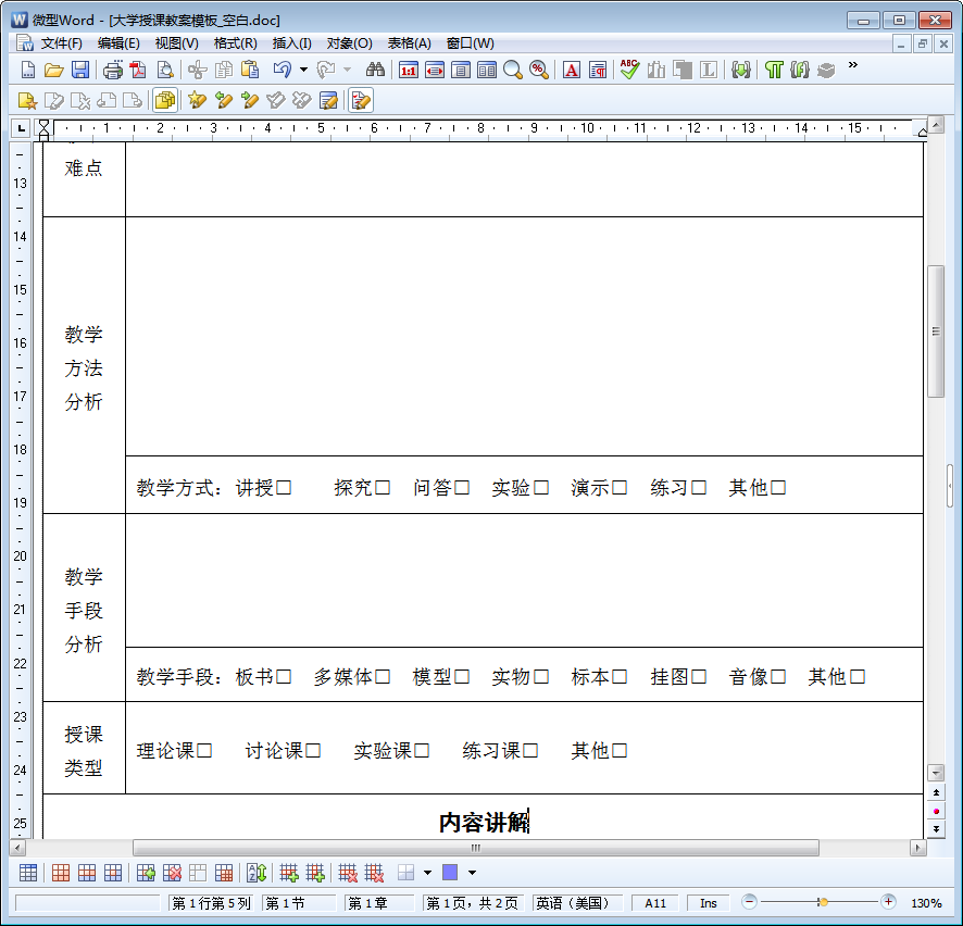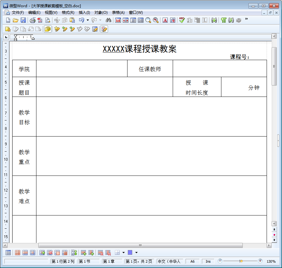 大学授课空白教案模板图样