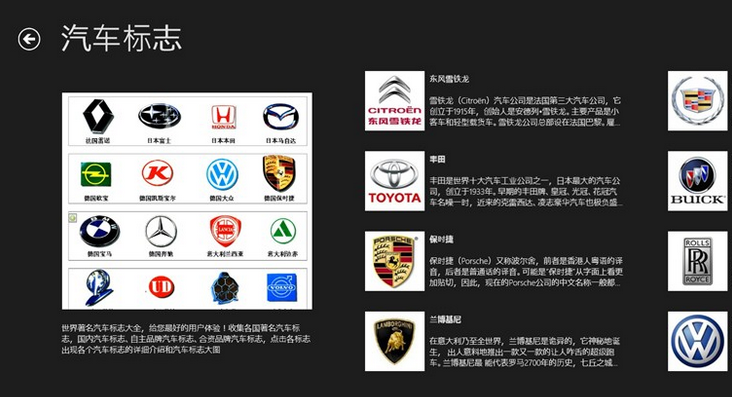 汽车标志百科win8是一款适合在win8系统里面应用的汽车标志查询软件。大家只需要打开这款软件,就能够在界面上找到很多自己感兴趣的汽车标志,特别是有很多大牌的国际顶尖标志供大家来免费观看与了解信息!