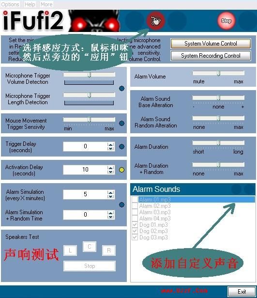 软件将电脑的鼠标和麦克风作为感应器,只要电脑周围有声音或鼠标被移动,电脑就会发出预先由您录制或设定播放的音频,例如您的咳嗽声,狗吠声,报警声等等,足以吓退准备作案的小偷或偷用电脑的人!