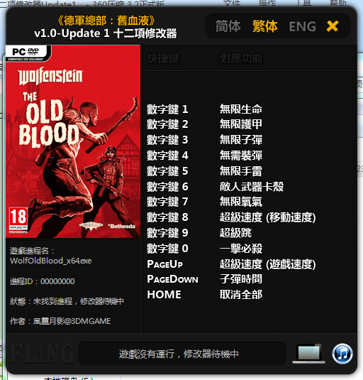 《德军总部:旧血液》十二项修改器Update1,更新支持最新一号升级档版本,使用时先运行游戏,再启动修改器。