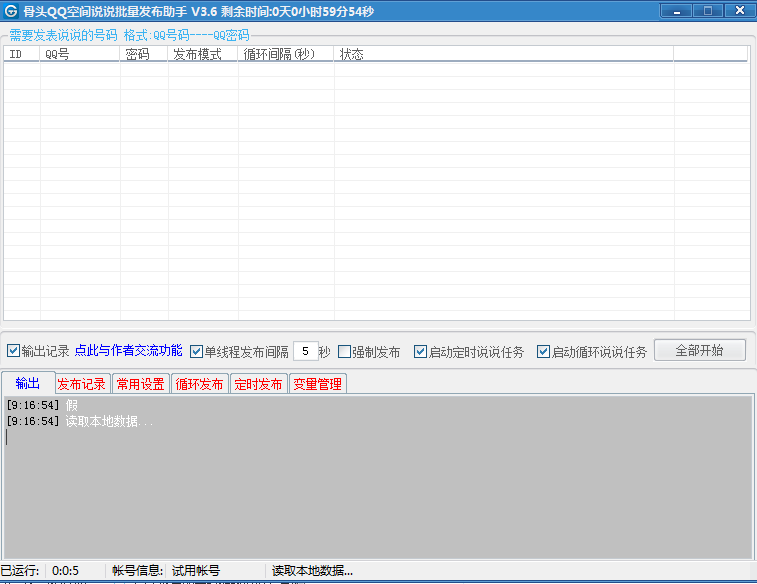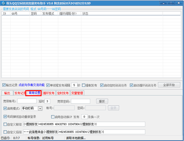 1.支持批量QQ循环发布说说:30分钟一次10分钟一次,随机取自己导入的说说内容