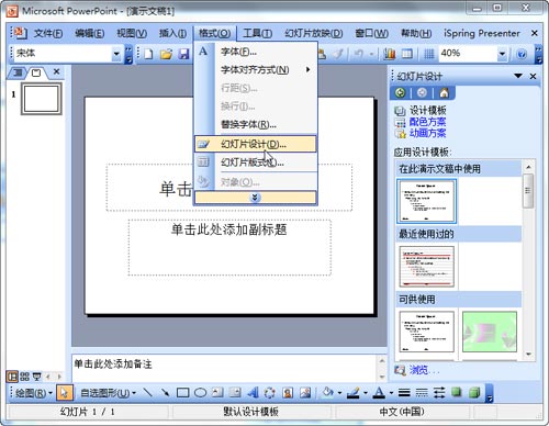 1、可以依次执行【格式】–>【幻灯片设计】–>【浏览】然后找到你下载的PPT模板点击应用就行啦。