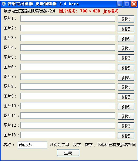 皮肤编辑器只允许选择700*438 JPG格式的图片,图片数量为13张,不能多不能少,必须正好13张(但是可以选择重复图片),否则皮肤将不能显示,然后输入您的皮肤名称,名称只能为字母、汉字、数字、不能为特殊符号,不能和已有皮肤名相同,然后点击生成即可。
