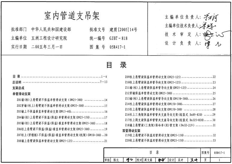05R417-1室内管道支吊架图集一般被简称为国标05r4171或是05r4171图集,该图集主要适用于动力、暖通专业;工厂车间、动力站及民用建筑(医院、图书馆、学校、住宅小区)等室内热力管道滑动支架、固定支架、吊架的制作与安装。本节内容小编为大家精选带来的是一份pdf格式超清完整版国标05r4171,该国标05r4171共有236页,除了内容完整之外,该图集字迹也十分清晰,有需要的朋友点击本文相应的下载地址进行下载即可!
