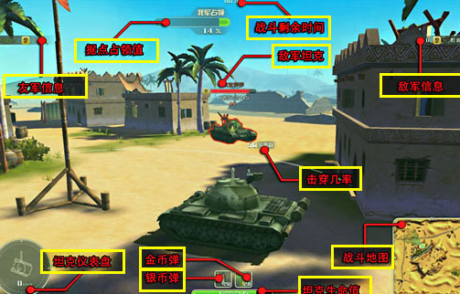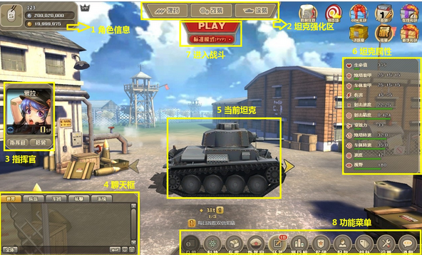 8.功能菜单包含 充值(暂未开放)、科技(研发坦克)、车库(可查看所拥有的坦克)、指挥官(可查找并训练所拥有的指挥官)、任务(查看可执行以及已完成的任务)、排行榜(查看全服务器的玩家排名)、军团(建立工会)、好友(可添加/删除好友)、组队(邀请好友一同参战)以及设置(修改画面、音频等)战斗界面