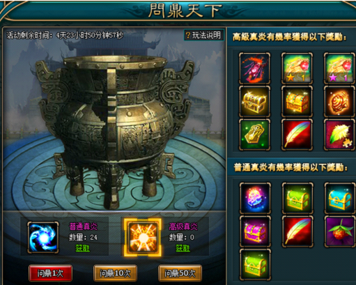 使用高级真炎问鼎,可100%获得奖励,有几率获得最高奖励。