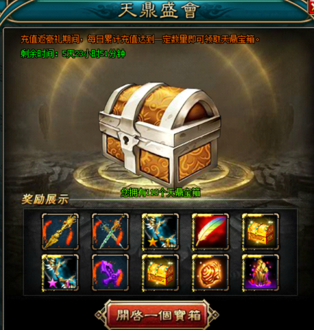 奖励说明:天鼎盛会界面中,点击开宝箱,即可消耗1个天鼎宝箱同时随机获得一份奖励,玩家有几率获得丰厚奖励,包括:兵器升级材料、红色宝物、宝石与天晶的封灵石以及四级天晶礼盒。