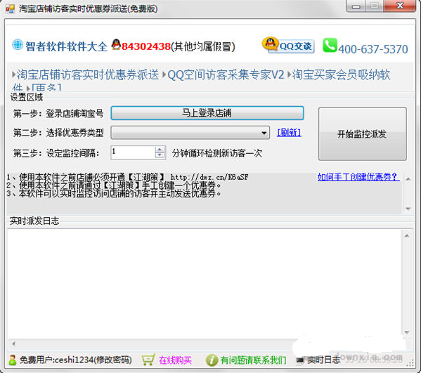 淘店铺访客实时优惠券派送是一款由智者软件为淘宝卖家店铺开发的一款淘宝优惠券派发软件。用户只要开启软件的“监控派发”的功能,就可以自动检测到访客来店铺,自动派发优惠券,免去你反复操作的麻烦。欢迎各位淘宝卖家前来下载,来挽留你的每一位潜在客户。