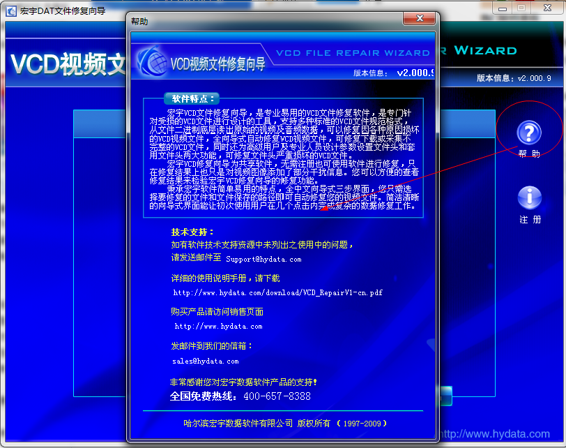 宏宇VCD修复向导为共享软件,无需注册也可使用软件进行修复,只在修复结果上也只是对视频图像添加了部分干扰信息。您可以方便的查看修复结果来检验宏宇VCD修复向导的修复功能。