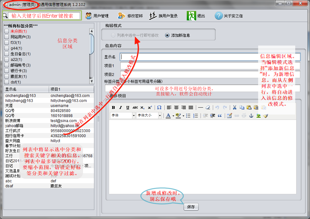 左侧下部是信息列表,将显示搜索框和选中分类下的信息。该列表最多显示200条,以便提高性能。整个软件和每个标签分类的信息数量是没有任何限制的。要精确定位信息,应通过搜索关键字和标签分类来查找和管理信息。虽然有软件,但养成良好的分类习惯也是很重要的。