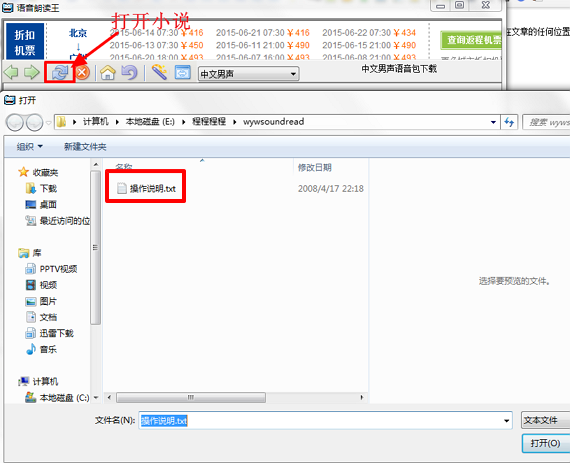 按钮介绍:上面的按钮分别为,上一页,下一页,打开文件,关闭文件,自动翻页,字体大小,语音阅读,语音设置,语言选择,正在阅读的文件名