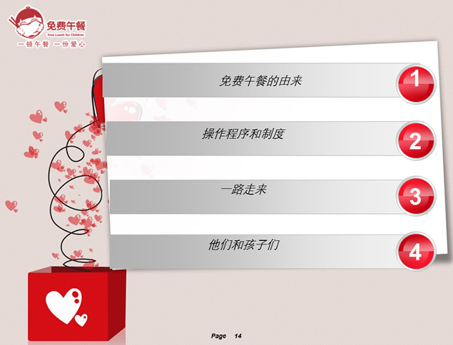 随着社会的发展,人们的生活都越来越好,走上了小康社会,可是还是有很多贫困地区,大山里的贫苦孩子吃不饱,这里小编带来免费午餐筹款宣讲公益ppt,内容详细完整,需要免费午餐ppt的朋友们点击下面的地址即可免费下载。
