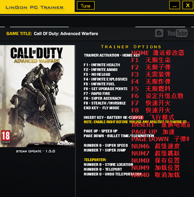 使命召唤11高级战争十七项修改器拥有无限子弹、无需装弹、无限炸弹、重换电池能源等一些强大的功能,喜欢的赶紧来下载使用吧。