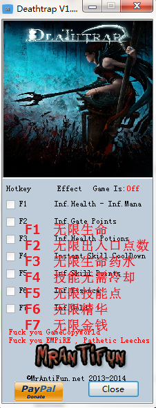 死亡陷阱八项修改器让你拥有无限生命、技能无需冷却、无限技能点、无限金钱等一切强大的功能,喜欢的赶紧来下载使用吧。