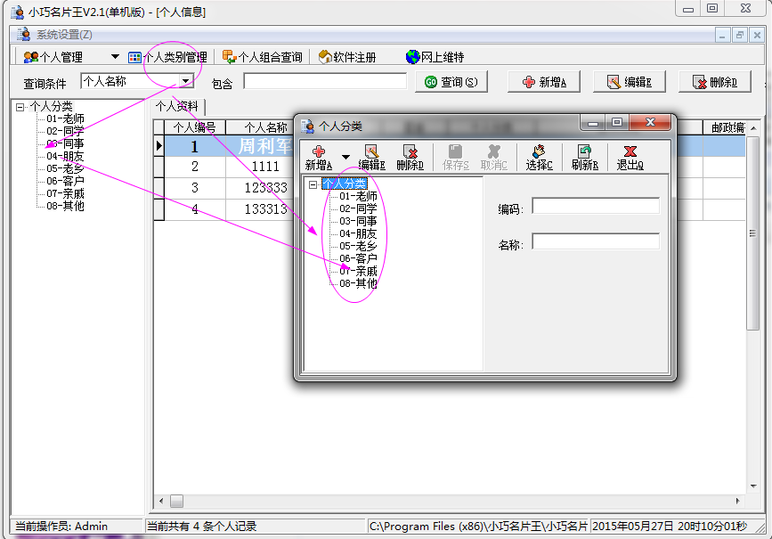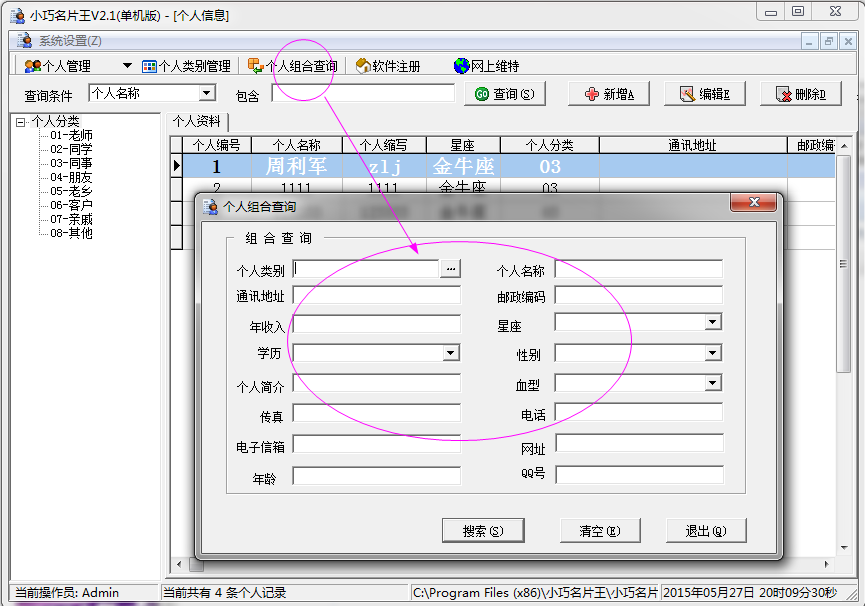 小巧名片王能记录大量的人员信息(包括:姓名.职务.公司.地址.电话.传真.手机.Email.QQ.邮编),并分类管理.供您方便的浏览.查询.为您的生活带来方便。