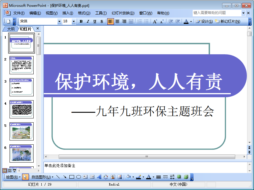 该ppt课件和前面小编为大家整理带来的小学三年级保护环境主题班会ppt相同的一点是这也是一份主题为“保护环境,人人有责”的ppt,不同之处在于这是一份适合初中阶段使用的环保ppt课件,该环保主题班会ppt共有29页,ppt内容丰富且全面,如果你需要这份九年九班环保主题班会ppt的话,点击本文相应的下载地址进行下载即可!