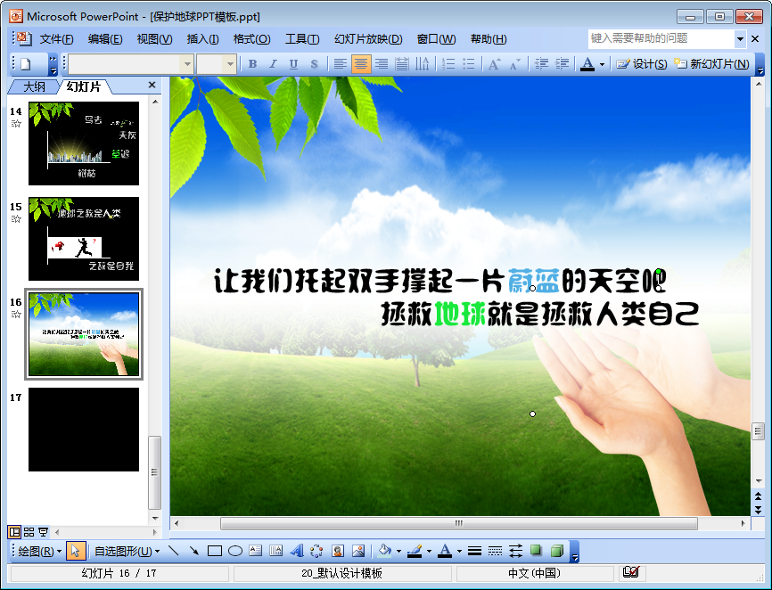 这是一份与环保有关的ppt模板——保护地球PPT模板——其实说是“模板”似乎有些不恰当,因为点击ppt的播放按钮一页页往下看,你会发现这是一份具有剧情的ppt——这样看来,如果说这是一份优秀环保ppt作品似乎更恰当,如果你想要欣赏一下这份ppt的话,那就赶紧来下载吧!
