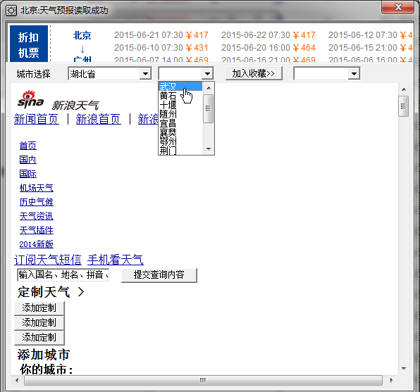 3,加入收藏,如果您觉得正在查询的城市比较常用,您可以点击加入收藏,就可以把这个城市加入到收藏里了,以后打开程序后您只要在收藏里选择就可以了,不必要在全国那么多城市里查找了。