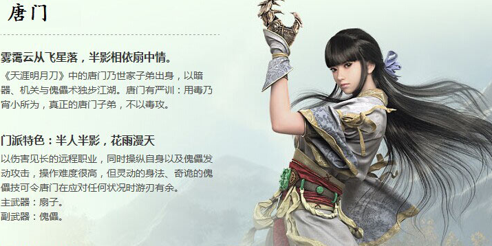 唐门:唐门 的定位是半远程打击PK职业。 蜀地巴中之“万青竹海”,便是唐门所在。其以暗器、机关独步武林,更因善使机关傀儡合击之术,被江湖人称为“半人半影”。真正的唐门高手,从不用毒。唐门血低攻低控制强刷怪很快,但PK时,很多技能要靠预判,而且极其怕近身,血薄攻低。
