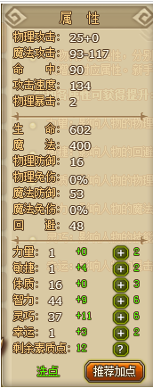人物有六大属性,分别为力量,敏捷,体质,智力,灵巧,幸运。增加属性点可以增加对应属性。新手玩家可使用人物面板上的“推荐加点”功能。