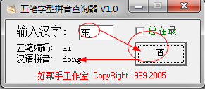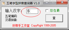 〖五笔字型拼音查询器〗收录6564个常用汉字五笔拼音编码查询,提供导出功能,每次查询都会记录,支持汉语拼音批量查询,支持五笔字型拆分,如遇软件查询不到的汉字,软件会将该字导出,方便您向作者反馈,以便软件能有更进一步的改进。